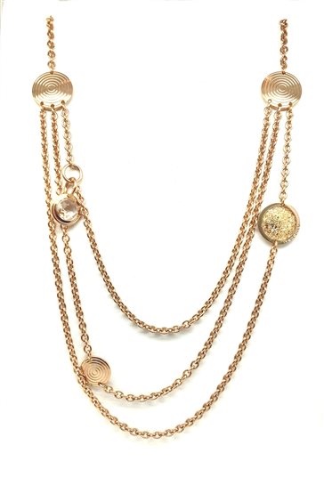 Collana a tre fili in bronzo con tre lunghezze diverse con ciondolo rotondi, uno con polvere di Swarovski.