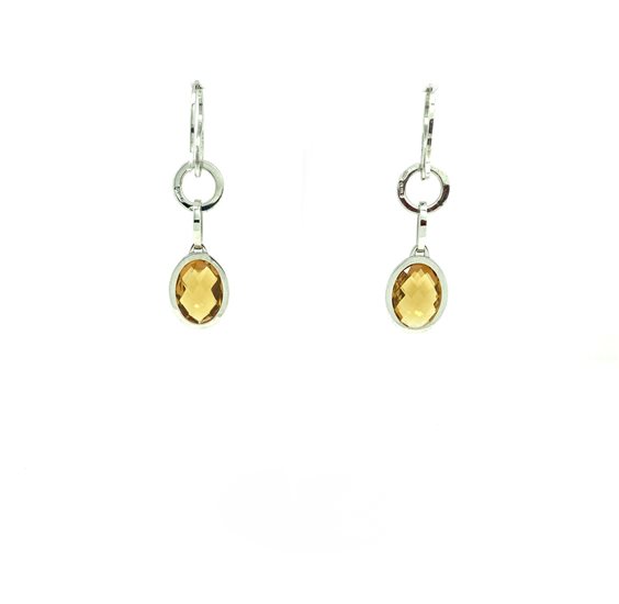 Orecchini in argento ad amo con catena e pietra ovale sfaccettata color ambra.