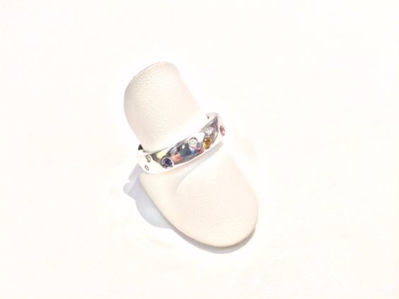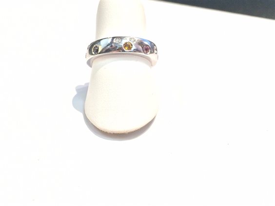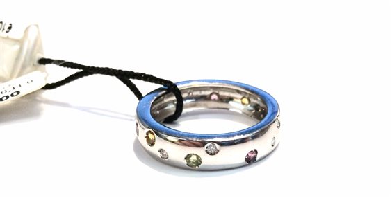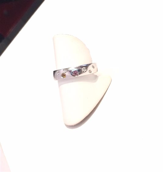 Anello in oro bianco alto 0.5cm con sparsi 12 diamanti,2 ametiste,1 acquamarina, 1 peridoto, 2 citrino, 1 zaffiro rosa.
