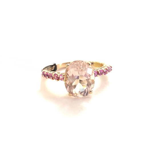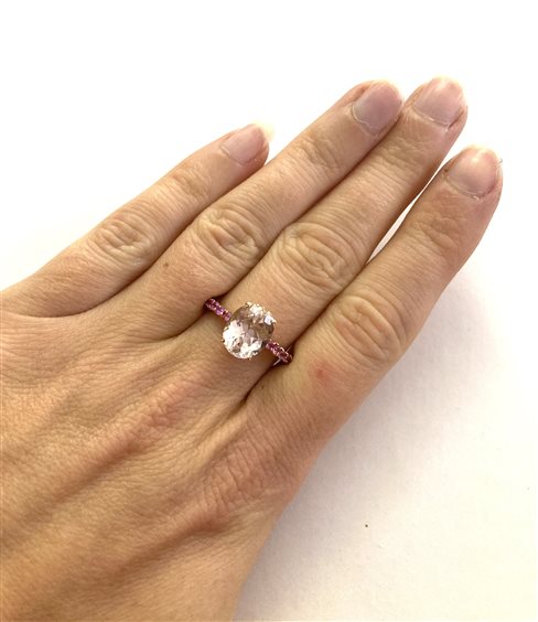 Anello in oro rosa 18 kt con 10 zaffiri rosa per un totale di 0,28 sul gambo e centrale una Morganite da 0,60 pt carato. Made in italy