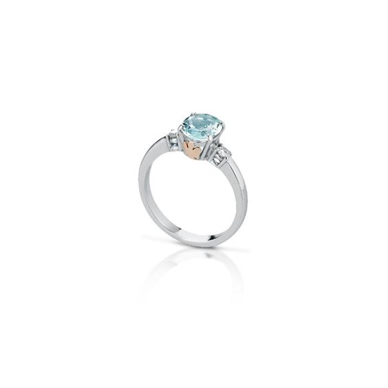 Anello in oro bianco con Angeli in oro rosa, diamanti e acquamarina. Un anello in oro bianco dal taglio classico ed elegante con dettagli unici e originali come la pietra in acquamarina e gli Angeli in oro rosa. Un'idea preziosa per una persona speciale, un'amica, una mamma. L'azzurro dell'acquamarina e la lucentezza dei diamanti di questo anello conferiscono al primo sguardo una sensazione di serenità e di luce e i piccoli Angeli in oro rosa sembra proteggere questa pace. Un gioiello prezioso e raffinato ideato per chi vuole essere elegante con un tocco di originalità in più. Oro bianco e rosa 375/°°° Carati diamanti 0,10 Carati acquamarina 1,00 - 8x6 mm