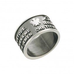 Anello in argento brunito con marcata la preghiera dell' angelo di Dio. Alto 1.1 cm