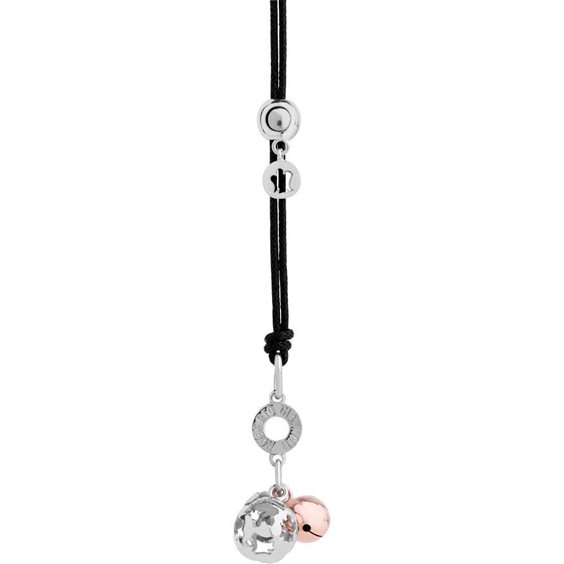 Ciondolo formato da tre parti, due palline traforate a forma di angeli, e un campanellino in oro rosa 9kt che emette un tintinnio. Chiusura a scorsoio in argento