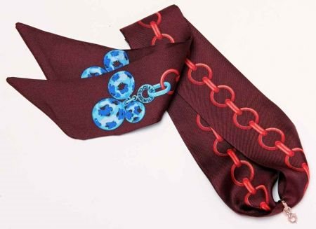 Foulard in seta marrone, arancione e azzurro con moschettone centrale in argento rodiato marrone.