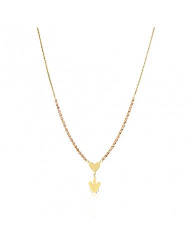 Collana in oro giallo 9 kt con ciondolo pendente da 1 cm a forma di angelo e uno a forma di cuore. Catena lavorata in modo da imprigionare dei cristalli rossi, che emanano una grande energia e ci aiutano a scoprire le emozioni nascoste nei dettagli della vita di ogni giorno.