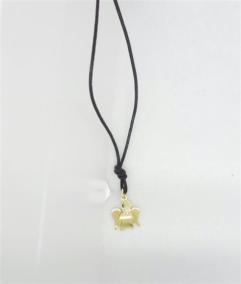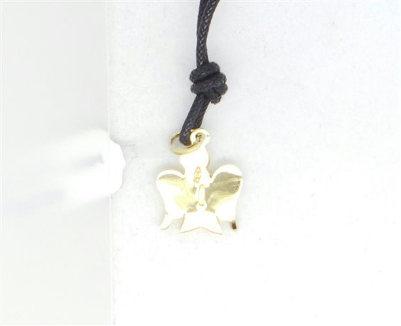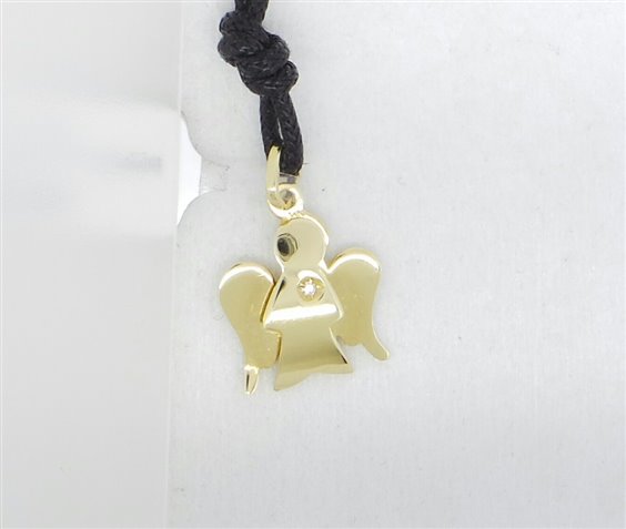 Pendente in oro giallo 375/°°° a forma di angelo, diamantino ct0,01 incastonato dalla parte del cuore dell'angelo, leggermente bombata la parte del corpo rispetto alle ali, cordoncino in cotone cerato nero.