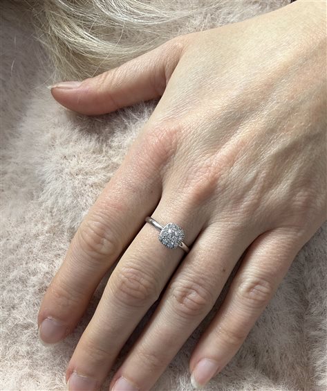 Anello in oro bianco 750/°°° con pavé di diamanti di diverse grandezze per un totale di 0,20 pt.