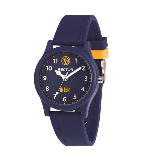 Orologio Sector x Inter. Cassa in plastica blu con vetro acrilico, cinturino in silicone blu con chiusura fibbia ardiglione, secondo passante giallo. Quadrante blu con dettagli gialli e numeri arabi applicati. Movimento solo tempo al quarzo. Fondello logato inter con viti, impermeabilità 5 atmosfere.