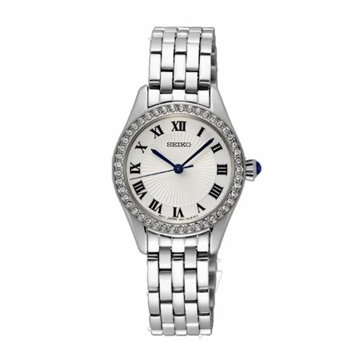 orologio da donna della serie Essential Time, movimento al quarzo a 3 sfere, cassa e bracciale in acciaio, lunetta con 45 cristalli Swarovski, quadrante decorato con motivo a raggiera, numeri romani, corona con cabochon blu