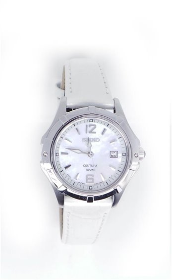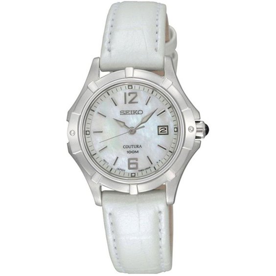 Orologio Seiko Coutura lady, solo tempo al quarzo, datario ore 3 , cassa in acciaio 28 mm, quadrante in madreperla, vetro zaffiro, cinturino in pelle, wr 100 m