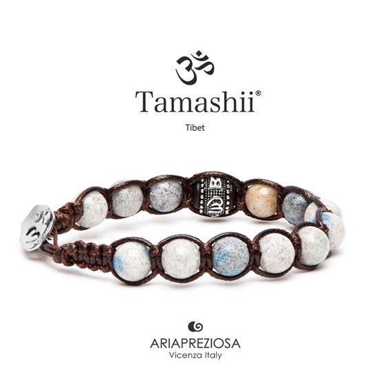 Bracciale unisex originale Tibetano Tamashii® della linea Ruota della Preghiera realizzato con pietre naturali di K2 stone e cordoncino marrone. Il bracciale è arricchito da una ruota in Argento 925/°°° a sfera con inciso il mantra “Om Mani Padme Hūm” del Buddha della compassione Cenresig.