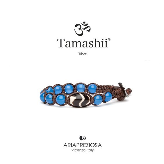 Tamashii Shonu SERENITA'con 11 pietre di agata blu, la nuova collezione dedicata alle nuove generazioni. La caratteristica predominante è la pietra GZI in onice con raffigurati disegni e figure simboliche. Ogni simbolo corrisponde ad una forza di supporto ai Tantra classici per rafforzare e perseguire i principi della filosofia Buddhista. I bracciali sono composti da pietre di 6 mm e la lunghezza minima è di cm. 14, ma si può adattare a qualsiasi polso grazie alle asole presenti nel cordoncino.