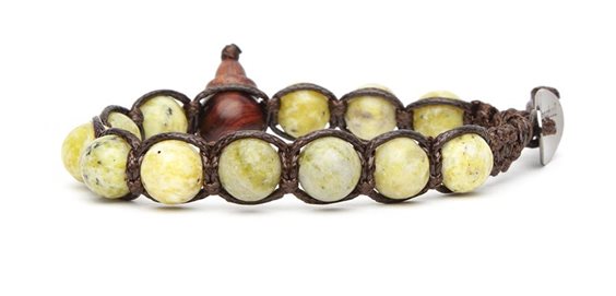 È una variante più inconsueta del Turchese classico che invece tende al colore azzurro/verde. Per i Tibetani rappresenta il cerchio della vita dalla nascita alla morte. Entrambi provengono dalle stesse miniere, ma in passato il Turchese giallo è sempre stato estratto in quantità minori rispetto al classico poichè considerato meno prestigioso. Il giallo è anche il colore dei monaci buddhisti. Il Tamashii® Turchese giallo calma l’animo trasformando l’ira in saggezza. Dona equilibrio, consapevolezza ed ascesa spirituale oltre a fortificare il radicamento con la Terra. Bracciale unisex originale Tibetano Tamashii® realizzato con pietra naturale Yellow Turquoise e cordoncino marrone. Misura pietre: 8 mm Taglia unica: il bracciale è predisposto per adattarsi a qualsiasi polso grazie alle asole già presenti (dove verrà infilato il bottone), una volta scelta la misura si può tagliere il cordoncino. Ogni bracciale è confezionato all'interno del packaging originale Tamashii® con dichiarazione di autenticità e garanzia.
