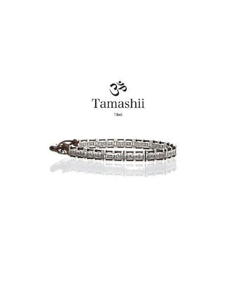 Bracciale della linea Bandiere Tibetane in Argento 925 anticato con trattamento isolante per conservare il più possibile il colore originale dell'Argento Le celebri bandiere della preghiera Lung-Ta vengono poste in luoghi estremamente isolati come sulle cime delle montagne Himalayane, in ambienti più comuni come case oppure in luoghi di culto come monasteri e templi Buddhisti. Sulle bandiere solitamente sono impressi dei Mantra che invocano armonia, compassione, saggezza, forza, pace e protezione. Si ritiene che il vento trasporti nell'aria, e nei luoghi circostanti, le benedizioni delle preghiere riportate su di esse. La linea richiama questi strumenti spirituali che secondo la cultura Tibetana sono in grado di portare pace, felicità e prosperità. La Misura è Medium: ogni singolo elemento è di 12 mm. Il bracciale è predisposto per adattarsi a qualsiasi polso grazie alle asole già presenti (dove verrà infilato il bottone), una volta scelta la misura si può tagliere il cordoncino e bruciarlo con l'accendino. Sul bracciale è inciso il Mantra “Om Mani Padme Hūm” del Buddha della compassione Cenresig, all'interno invece è inciso il logo Tamashii.