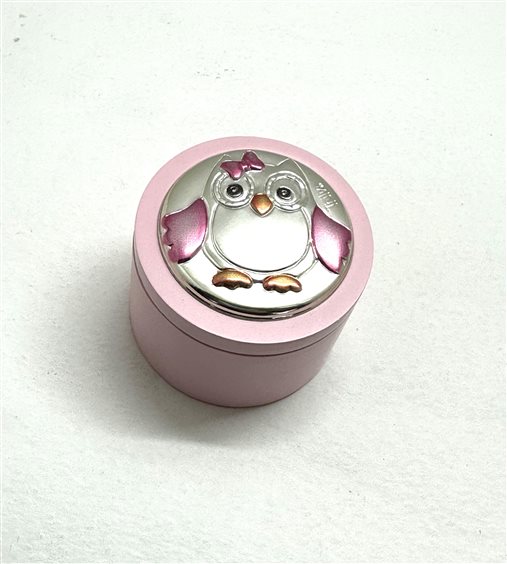 Scatolina porta dentino per bambina in legno rosa e targhetta in laminato argento e smalto a forma di gufo. Diametro 5cm altezza 3.5 cm
