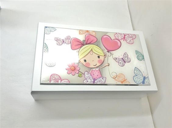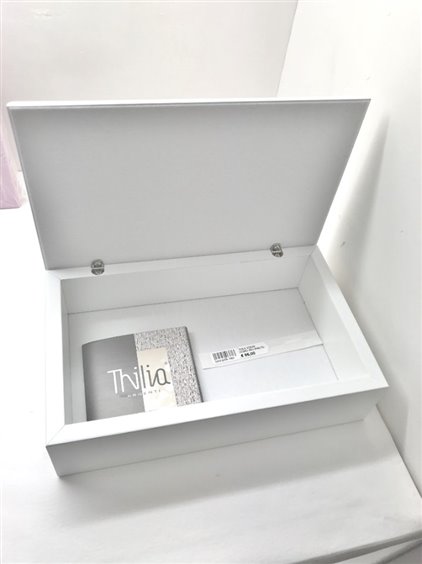 Scatola in legno bianco con targa in laminato argento e smalto. Interno in velluto bianco e legno.