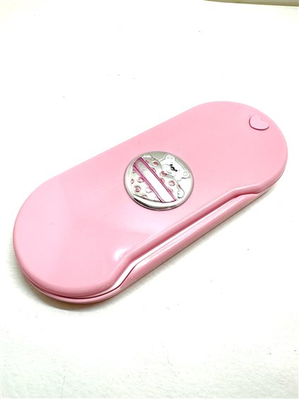 Portaposate in policarbonato rosa e targhetta in laminato argento e orsetto.