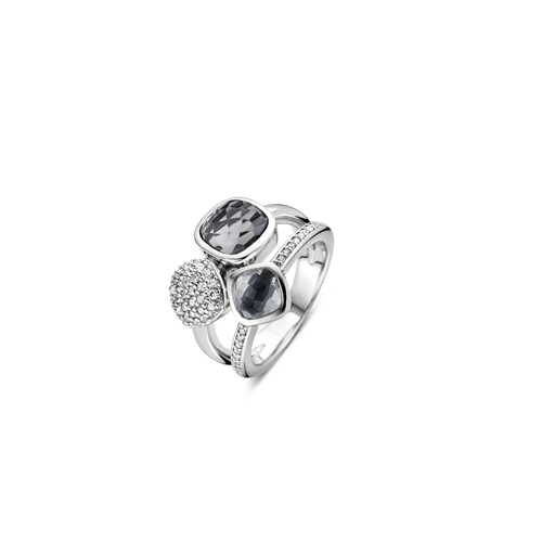 Anello composto da due pietre di quarzi fumè quadrati e sfaccettati e uno in pavè di zirconi, legati assieme da due anelli di cui uno con zirconi.