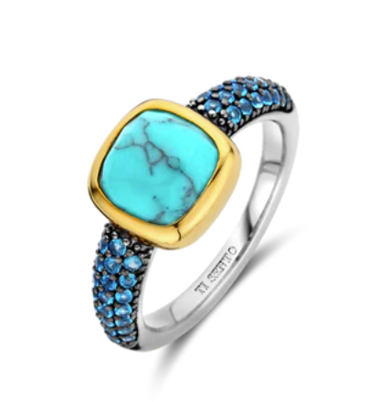 Anello con turchese su castone giallo centrale e pavè di cubic zirconia azzurre