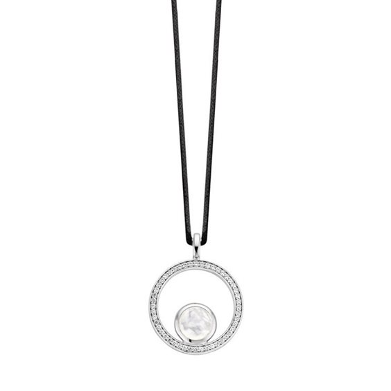 Ciondolo in argento con zirconi e madreperla centrale. Contro maglia che si può aprire per essere agganciata su una collana. viene fornito di cordino nero in cotone.