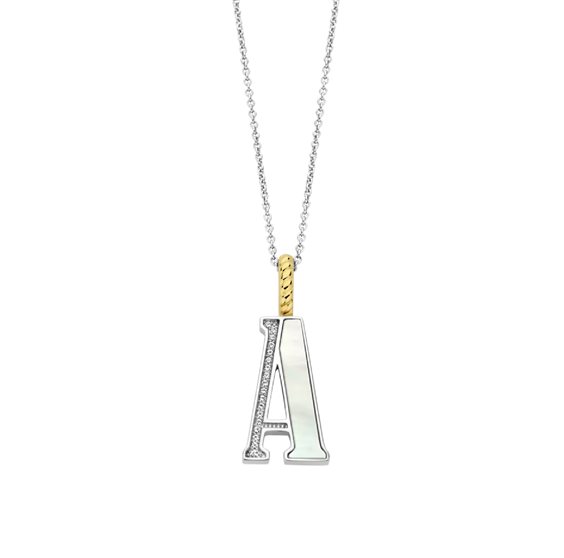 Collana TI Sento Milano iniziale lettera A a pendente in argento 925 rodiato bianco con inserto dorato giallo e piccoli zirconi. Lunghezza 45cm Cod. 6840ZY_A Un gioiello per chi è sempre alla ricerca di un'accessorio per esaltare il proprio look sia in occasioni speciali che tutti i giorni, realizzato in argento placcato ad alto spessore così da renderlo durevole e anallergico