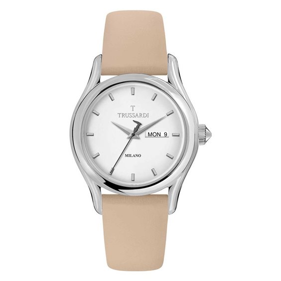 Orologio rotondo ,sfondo bianco con lancette argento e datario h3, vetro piatto minerale,corona e fondello a pressione. Cinturino in pelle liscia beige opaca, easy click mm 22