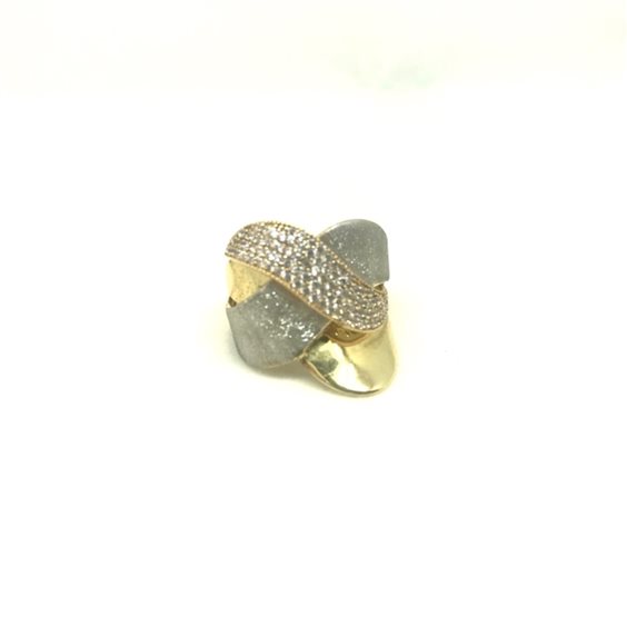 Anello in oro giallo, con fascia in oro bianco satinata e oro rosa tempestata di zirconi. manifattura 18.75