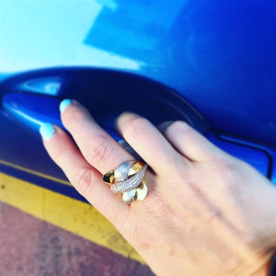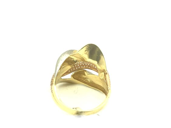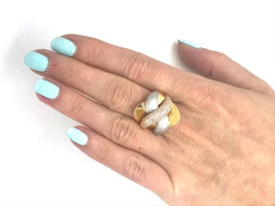 Anello in oro giallo con onde e decori in oro bianco satinato stellato, e pavè su oro rosa. manif 18.75