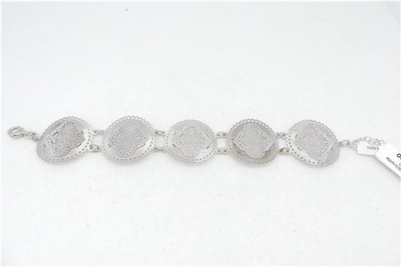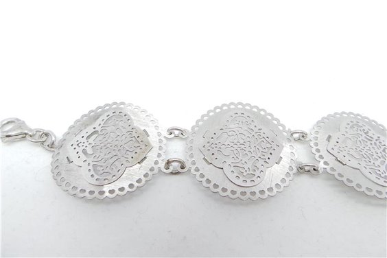 Bracciale in argento 925 senza nichel, satinato con decori lucidi. Cerchi di 2,5 cm, lungo cm da 16 a 20, grazie alla catenella.