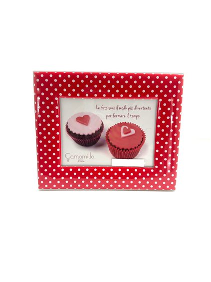 Cornice Camomilla in argento laminato e smalto rosso a pois, legno bianco.