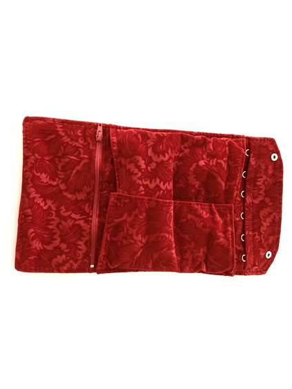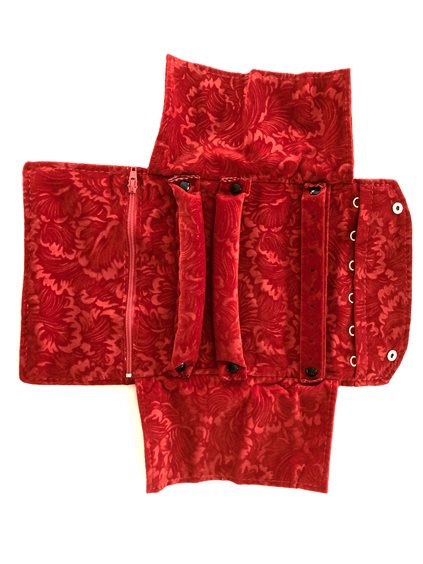 portagioielli da viaggio in velluto rosso damascato con 2 rotolini per anelli, 6 ganci per collane 10 fori per orecchini e tasca con zip.