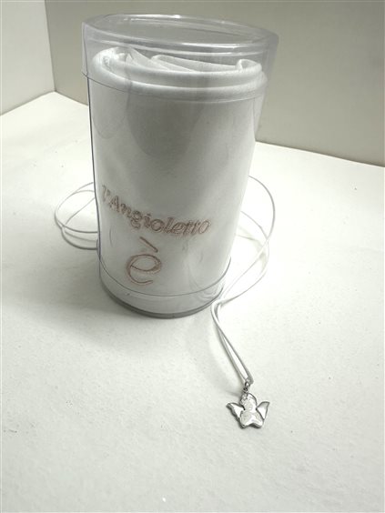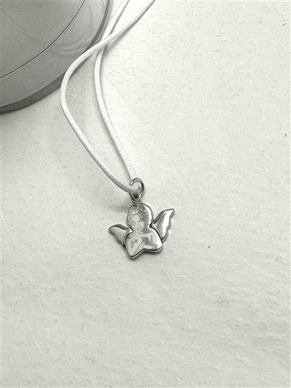 Ciondolo in argento a forma di angelo con smalto bianco, venduto con cordino bianco e berrettino bianco per bimba.