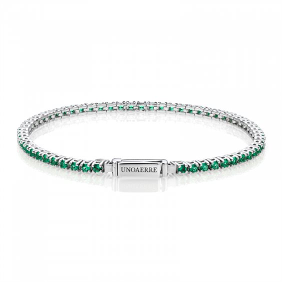 Bracciale Tennis in argento 925 con pietre zirconia cubica verdi e chiusura a cassetta con logo. Immergiti nella luce e nel colore di questo bracciale e divertiti a mixarlo con gli altri in blu e in rosa per un'esplosione di energia irresistibile! Perfetto anche con i cerchietti verdi coordinati.
