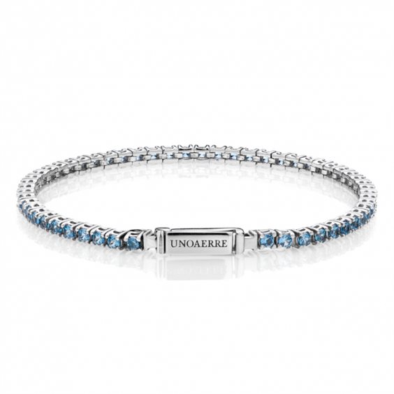 Bracciale Tennis in argento 925 con pietre zirconia cubica azzurre e chiusura a cassetta con logo. L'eleganza intramontabile di un gioiello iconico si tinge di un delicato azzurro cielo ed è subito magia. Segui il trend mix-and-match ed indossalo insieme agli altri bracciali Tennis colorati.