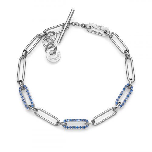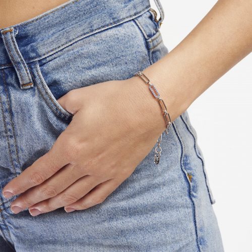 Bracciale in argento 925 rodiato con catena forzatina paper clip. Il bracciale è impreziosito da tre maglie con pietre zirconia cubica azzurre e dalla pratica chiusura T-bar con anelli di allungamento. Il design dinamico e grintoso della maglia paper clip si arricchisce di luce e colore in questo bracciale ed accende il tuo stile con una sferzata di colore.