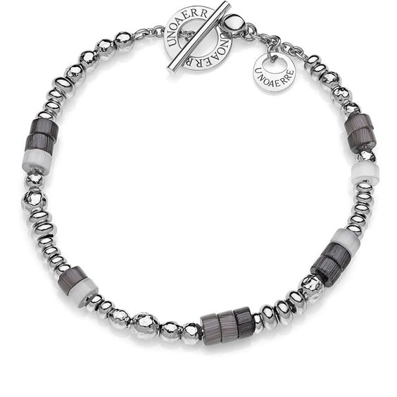 Bracciale in argento 925 rodiato con sfere lucide martellate e dischetti grigi. Chiusura a T-bar con logo UNOAERRE. Aggiungi un'allegra nota di colore al tuo look con questo braccialetto dall'eleganza contemporanea e vivace. Abbinali tra loro ed indossa più di un colore insieme. Crea il tuo mix personale ed esprimi chi sei. Misura 18,50 cm.