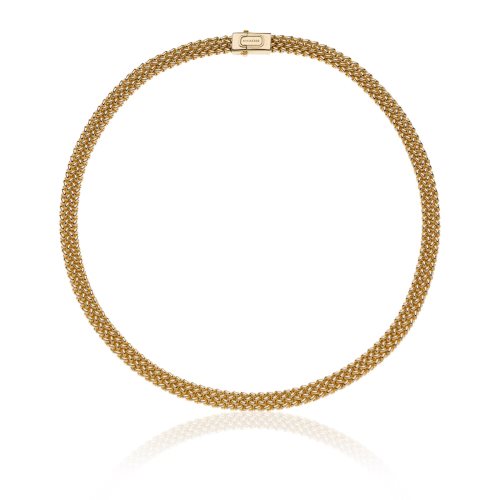 Materiale: Argento Colore: Dorato Bagno galvanico: oro giallo 18 kt mezzo micron garantito Finitura: lucida Altezza fascia: 0,7 cm Chiusura: a cassetta Misura: 42,00 cm