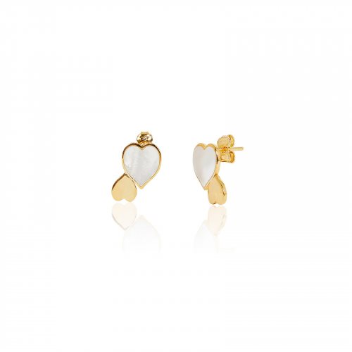 Orecchini con cuore centrale in madreperla e cuore piccolo in oro 9kt. Chiusura con perno e farfallina. Due romantici cuori s'incontrano e si toccano in questa raffinata creazione che celebra in modo contemporaneo una forma iconica ed intramontabile. Poiché "Tutto ciò di cui hai bisogno è amore" e magari anche un paio di orecchini in oro e madreperla.
